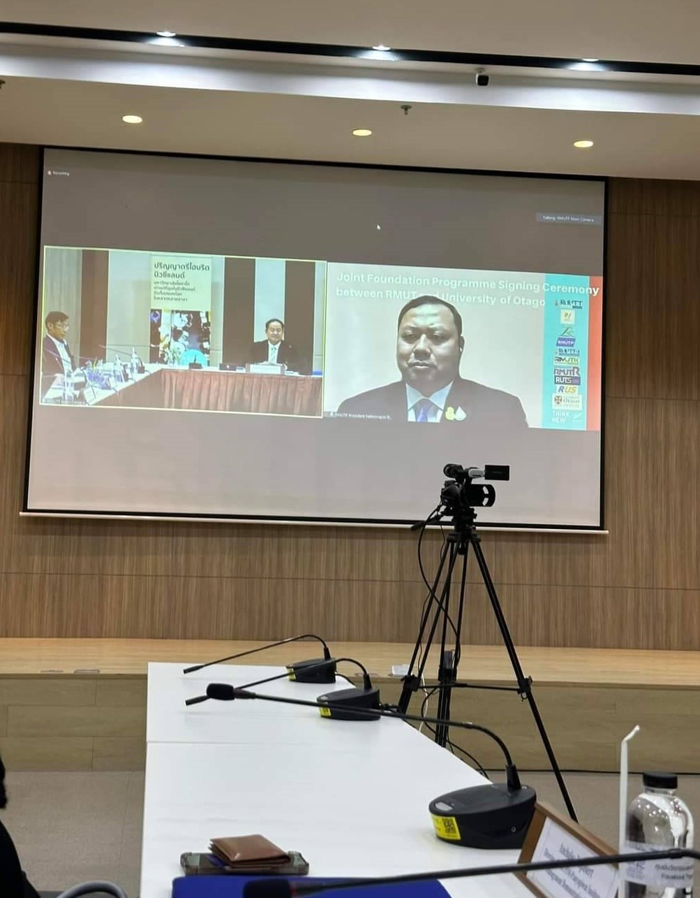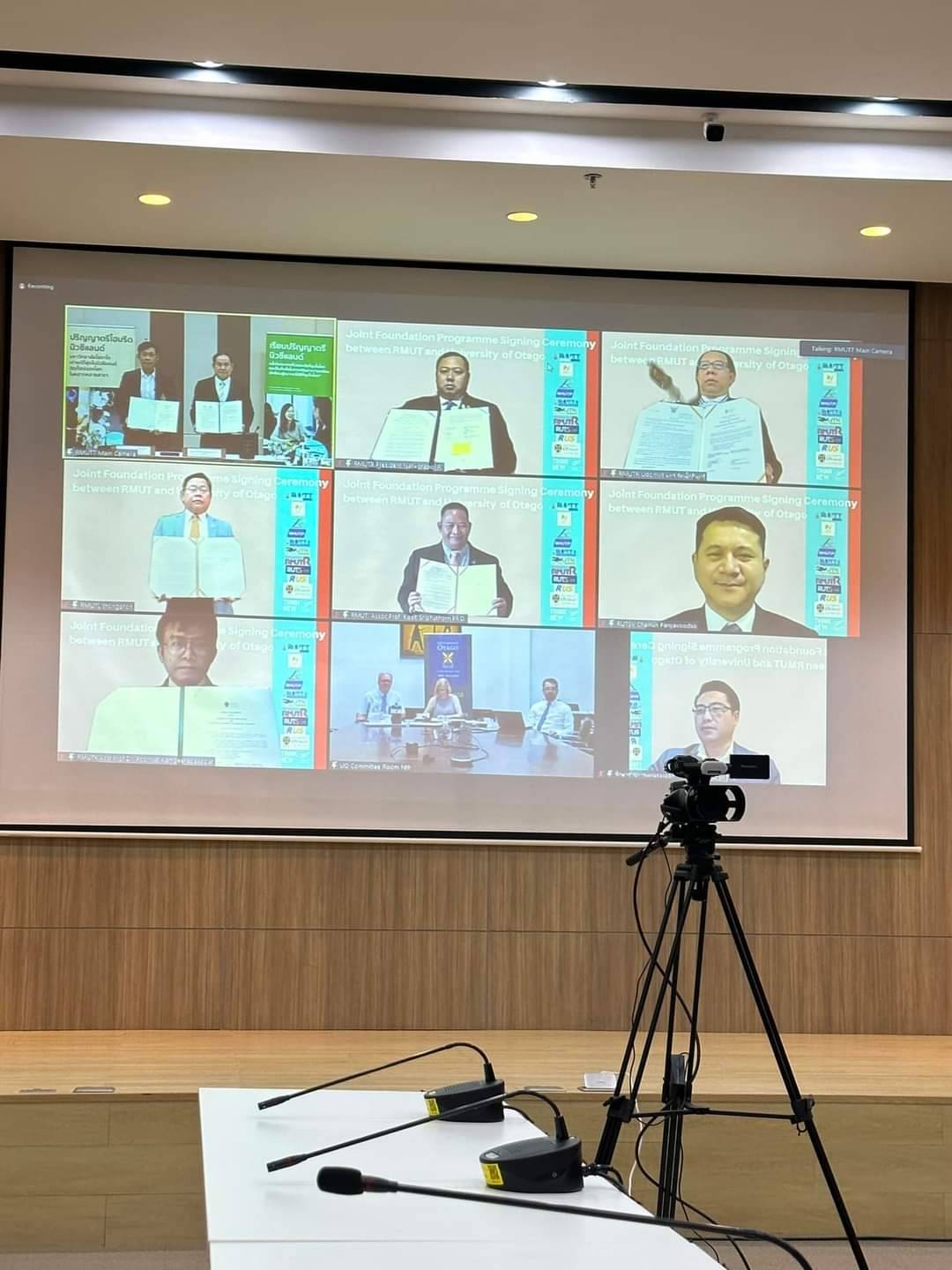 ดร.ณัฐวรพล รัชสิริวัชรบุล อธิการบดีมหาวิทยาลัยเทคโนโลยีราชมงคลพระนคร เข้าร่วมพิธีลงนามความร่วมมือหลักสูตรปริญญาตรีไฮบริดนิวซีแลนด์ กับ มหาวิทยาลัยโอทาโก (University of Otago) ประเทศนิวซีแลนด์ ร่วมกับอธิการบดีมหาวิทยาลัยเทคโนโลยีทั้ง 9 แห่ง ผ่านช่องทางออนไลน์ โดยมี ผศ.ดร. รัตนาวลี ไม้สัก คณบดีคณะบริหารธุรกิจ เข้าร่วมพิธีลงนามทางออนไซต์ ณ ศูนย์การเรียนรู้ ไทย-นิวซีแลนด์ (TNZC) มทร. ธัญบุรี เมื่อวันที่ 4 กุมภาพันธ์ 2566 ที่ผ่านมา