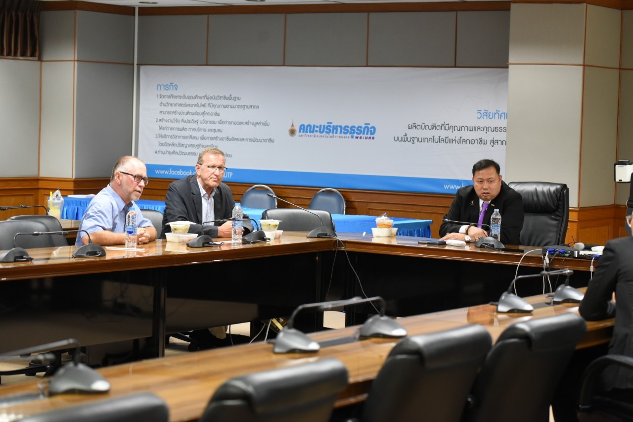 ดร.ณัฐวรพล รัชสิริวัชรบุล อธิการบดีมหาวิทยาลัยเทคโนโลยีราชมงคลพระนคร พร้อมด้วย ผศ.ดร.รัตนาวลี ไม้สัก คณบดีคณะบริหารธุรกิจ ร่วมหารือกับ Prof. Dr. Manfred Kiesel และ Prof. Dr. Rainer Wehner จาก International Management Department มหาวิทยาลัย Technical University of Applied Science Wuerzburg-Schweinfurt (THWS) สหพันธ์สาธารณรัฐเยอรมนี เรื่องแนวทางความร่วมมือในการเพิ่มโอกาสการแลกเปลี่ยนนักศึกษาไทย-เยอรมนี และการเปิดโอกาสในการทำงานของนักศึกษาไทย ณ สหพันธ์สาธารณรัฐเยอรมนี ภายหลังจากสำเร็จการศึกษา เมื่อวันที่ 22 กันยายน 2566 ณ คณะบริหารธุรกิจ ศูนย์พณิชยการพระนคร