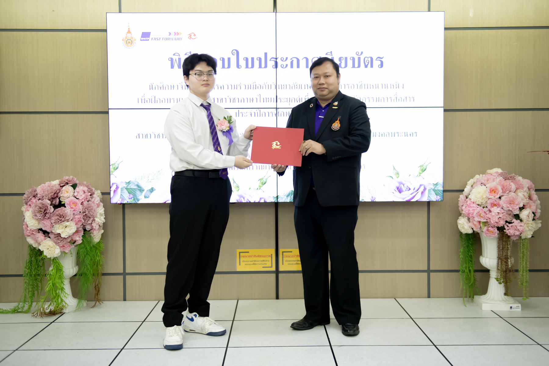 เมื่อวันที่ 13 พฤษภาคม 2568 ดร.ณัฐวรพล รัชสิริวัชรบุล อธิการบดีมหาวิทยาลัยเทคโนโลยีราชมงคลพระนคร เป็นประธานมอบประกาศนียบัตรแก่นักศึกษาจีนในโครงการความร่วมมือกับวิทยาลัยเทคโนโลยีการอาชีพหนานหนิง เพื่อฝึกอบรมหลักสูตรสาขาวิชาภาษาไทยประยุกต์เพื่ออาชีพ และนวัตกรรมการสื่อสาร ประจำปีการศึกษา 2567 โดยมีนักศึกษาจีนสำเร็จการศึกษาในหลักสูตรของสาขาวิชาภาษาไทยประยุกต์ คณะศิลปศาสตร์ และมีระดับผลการเรียนผ่านตามเกณฑ์การเทียบโอนผลการเรียน สามารถนำผลการเรียนไปเทียบโอนเข้าศึกษาต่อในหลักสูตรศิลปศาสตรบัณฑิตได้ รวมทั้งสิ้น 10 ราย พร้อมได้มอบทุนพระบารมีเสด็จพ่อ (พลเรือเอก พระเจ้าบรมวงศ์เธอ พระองค์เจ้าอาภากรเกียรติวงศ์ กรมหลวงชุมพรเขตอุดมศักดิ์) ให้แก่นักศึกษาจีนที่มีผลการเรียนดีเด่น จำนวน 2 ราย อีกด้วย