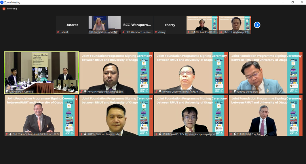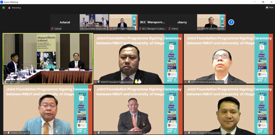 2023年2月4日,Natworapol Rachsiriwatcharabul 博士(曼谷皇家理工大学校长)通过线上方式与新西兰**奥塔哥大学(University of Otago)**及泰国其他八所皇家理工大学校长共同签署了“新西兰混合模式本科课程”合作协议。此外,曼谷皇家理工大学管理学院院长 Rattanavalee Maisak 助理教授博士亲临曼谷皇家理工大学坦亚武里分校的泰-新西兰学习中心(TNZC)参加了线下签约仪式。