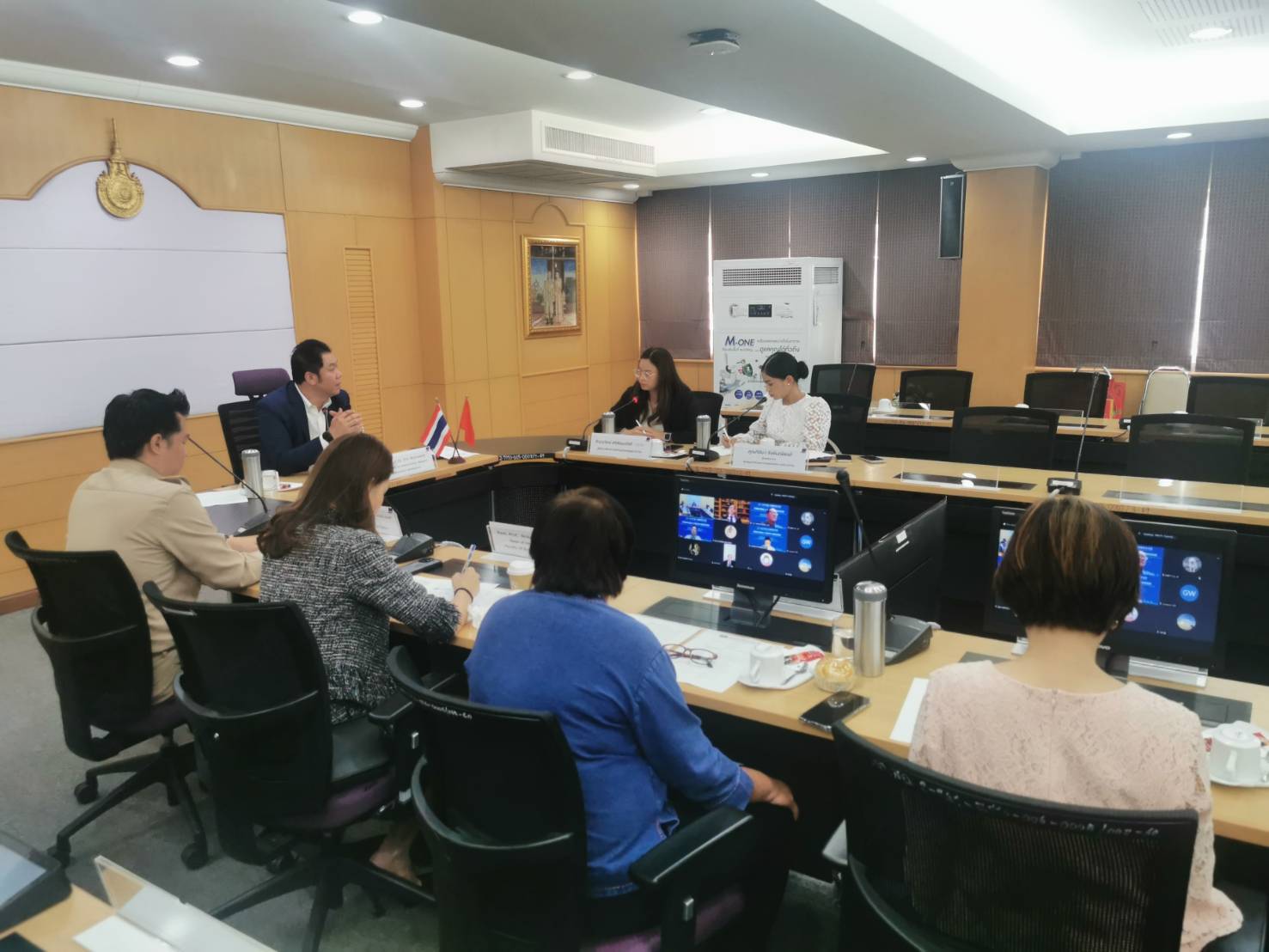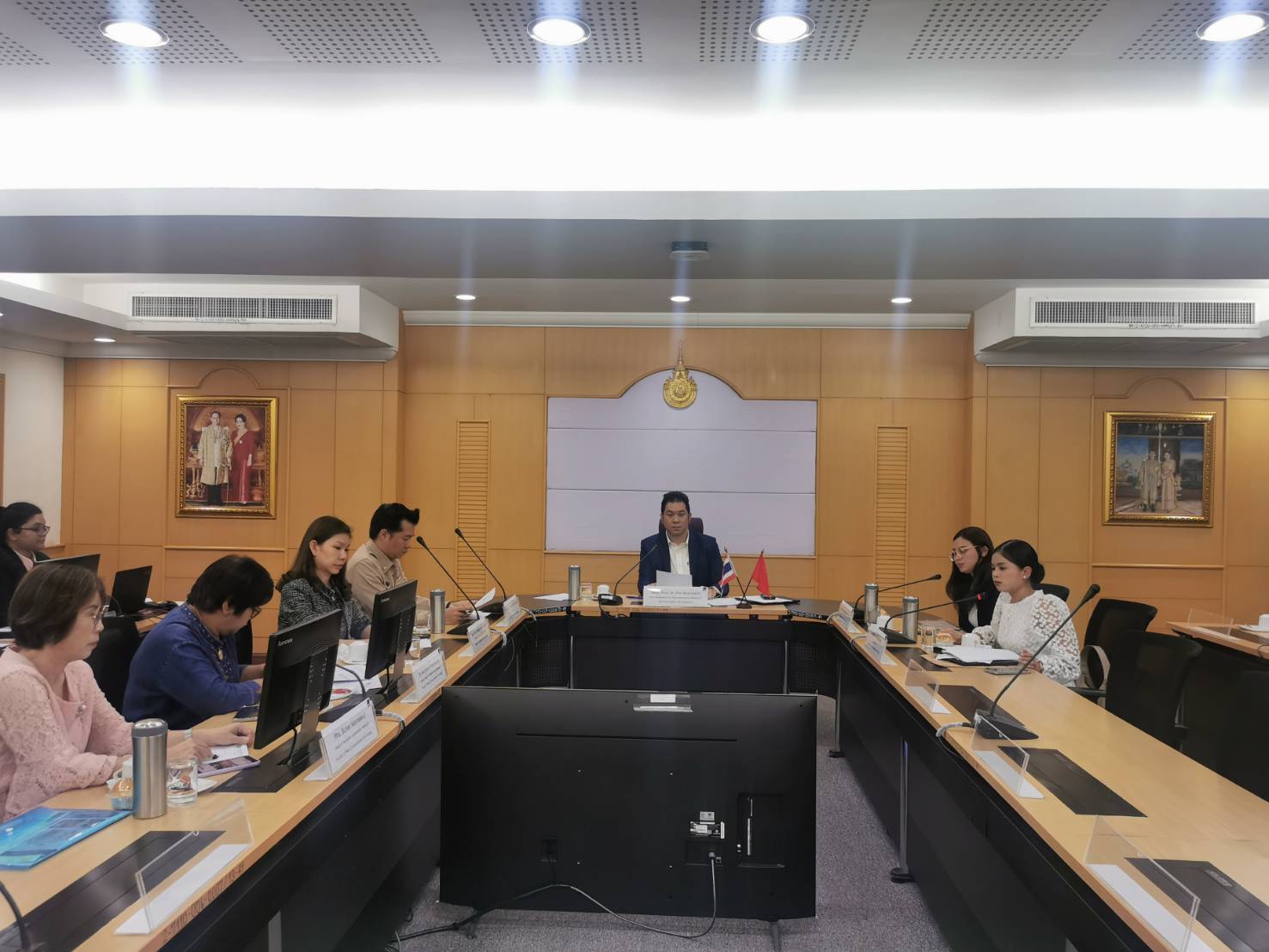 On September 17, 2024, Asst. Prof. Dr. Prin Boonkanit, Vice President for Administration, Research, and Innovation Development at Rajamangala University of Technology Phra Nakhon (RMUTP), presided over an online meeting with Mr. Mo Khun, President of Chongqing City Management College, and Mr. Zhu Yu Gao, Party Secretary and Principal of Chongqing Youth Vocational and Technical College, P.R. China. The meeting took place at the Raphiphat Meeting Room, Office of the President, Thewet Center.