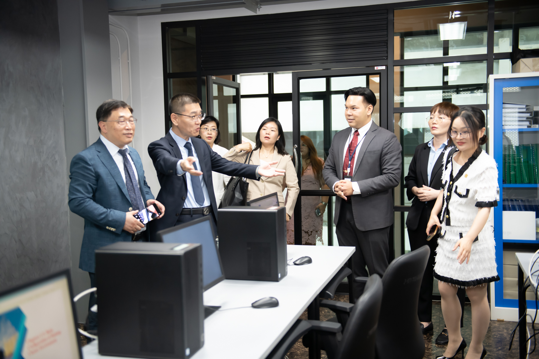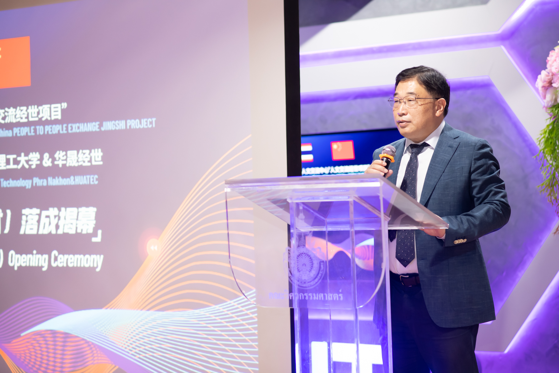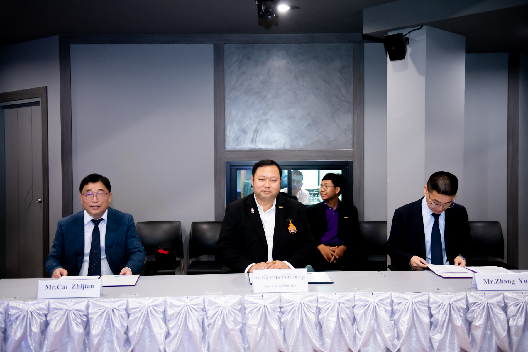 The distinguished delegation included Mr. Cai Zhijian (Chairman of the College Committee, Guizhou Polytechnic), Ms. Zhang Yu (Chairwoman of Huatec), and senior academic directors from both institutions. The event took place at the Institute of Digital Interdisciplinary and Robotics, RMUTP (North Bangkok Center).